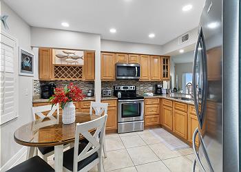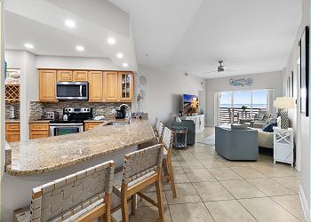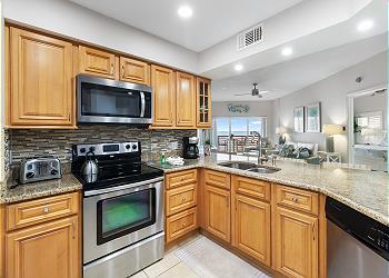 The newly remodeled kitchen offers granite countertops, stainless steel appliances including french door refrigerator, maple wood cabinets, underground stainless sink, nickel faucets and all utilities you will need for your visit. New pendant lighting surrounds the kitchen and bar seating area. In the living room, new leather sofa, flat screen TV with DVD offers a quiet space for relaxing. Offering sensational beach and pool views on the huge side balcony. Enjoy colorful sunsets from this one of a kind vantage point!