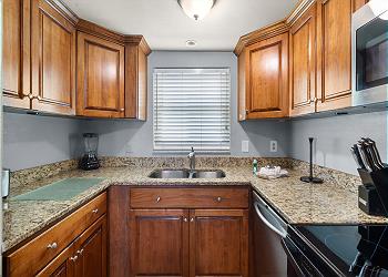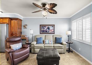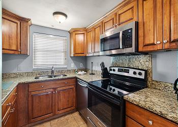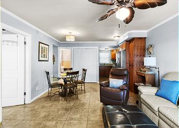 Surf Song Resort [45]Surf Song 223 - Escape to island life in this 2 bedroom, 2 bath poolside condo on the second floor with a view of the Gulf of Mexico. The entire condo has been recently updated with new furnishings, decor, and all new paint. The kitchen has went through a recent full renovation with new cabinets, granite countertops, and updated appliances. You will also find an ample supply of dishes, silverware, pots & pans, and small appliances. Relax in the living room that includes a leather sofa with ottoman and a comfortable leather recliner to lounge and enjoy the flat panel cable TV with DVD player. The dining table can seat up to four. The large main bathroom includes a tub/shower combo. In the master bedroom suite, you will find a king bed along with a large dresser and closet for plenty of storage. There is also an attached 3/4 bath with large shower. The second bedroom includes two twin beds, dresser, and nightstand.